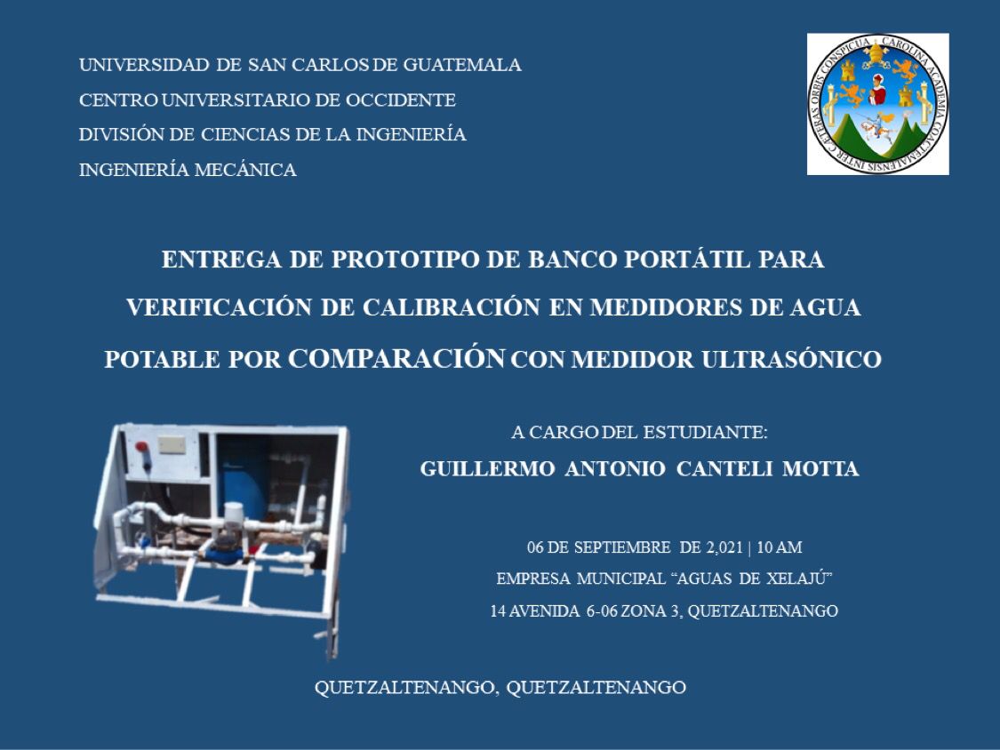 El día 06 de septiembre El estudiante Guillermo Antonio Canteli Motta, estudiante de Ingeniería Mecánica hizo la Entrega de Prototipo de Banco Portátil para Verivficación de Calibración en medidores de Agua Potable por Comparación con Medidor Ultrasónico a la Empresa Municipal "Aguas de Xelajú" ubicado en 14 Avenida 6-06 de la Zona 3 Quetzaltenango